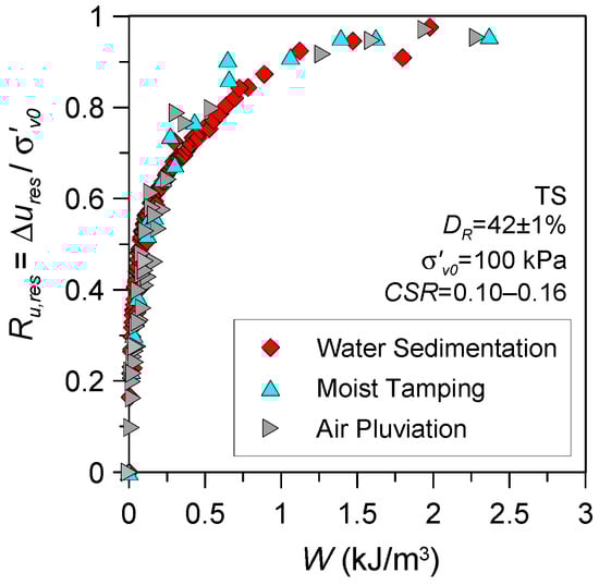 Figure 11 shows the residual excess pore water pressure ratio versus cumulative dissipated energy for Ticino clean sand specimens prepared in the same initial state (a combination of packing density and initial vertical effective stress) but reconstituted using three different reconstitution methods, namely moist tamping, air pluviation, and water sedimentation. Interestingly, different soil fabrics induced by different reconstitution methods do not influence significantly the trend of Ru vs. W. A similar conclusion was made in previous research considering a pore-water-pressure-strain-based approach, while for stress-based PWP models this finding does not appear applicable [41].