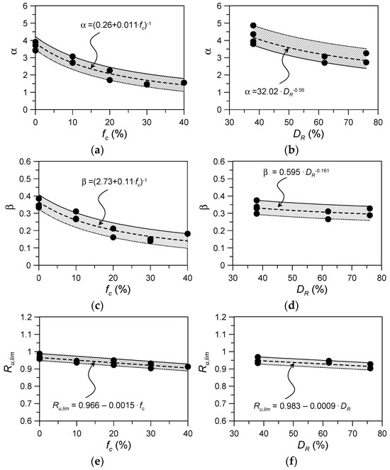 Correlations for α, β, and Ru,lim parameters of the revised energy-based PWP model [Equation (7)] as a function of (a,c,e) fc and (b,d,f) DR for silty sands.