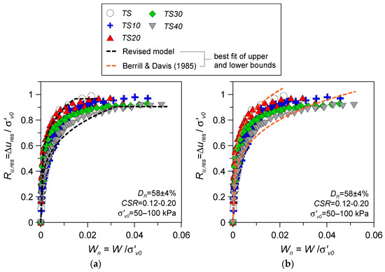 The performance of the revised model with respect to the original one proposed for clean sands by Berrill and Davis [29] was verified and illustrated in Figure 13 in the Ru,res-Wn plane. It is notable that when the revised model was applied to the CSS test data for Ticino silty sand, all data points were well located (R2 > 0.91) within a narrow zone bounded by an upper and lower bound defined by the following range of parameters: α = 5.29–2.15, β = 0.25–0.38, and Ru,lim = 0.97–0.91 (Figure 13a).