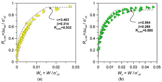 When normalisation was applied, a unique Ru,res-Wn relationship for different σ′v0 values was obtained, as shown in Figure 10b. The observation that the influence of σ′v0 is negligible in the Ru-Wn relationship is consistent with the results of the study conducted by Konstadinou and Georgiannou [42] (among others). This experimental evidence stresses the importance of normalising cumulative dissipated energy to initial vertical effective stress to unify Ru,res-Wn trends, regardless of the initial vertical effective stress value.