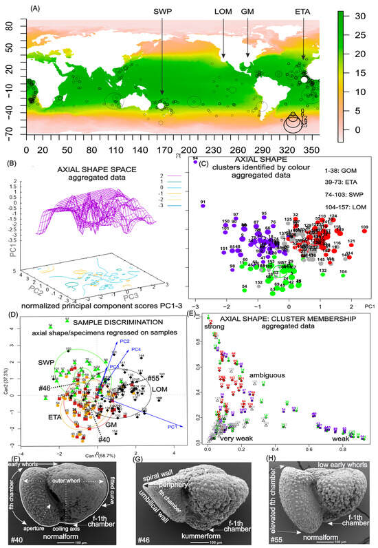 (A) Localities sampled in this study plotted on global sea surface temperatures from CARS 2009 [10]. Shown are the records of Truncorotalia crassaformis in the ForCenS database [11] with abundance ≥2%. (B) Principal component (PC1-3) projection using nearest-neighbour interpolation of the aggregated data on the axial outlines of specimens processed and normalized by the procrustes algorithm. (C) Fuzzy clusters in the data of (B) identified using the FKM algorithm [12]. (D) Generalized canonical discriminant analysis of a multivariate linear model of the collections using PC1-3 data of (B). (E) Strength of cluster membership in the analysis of (C). (F–H) Features of shell architecture in axial orientation and source of outline data.