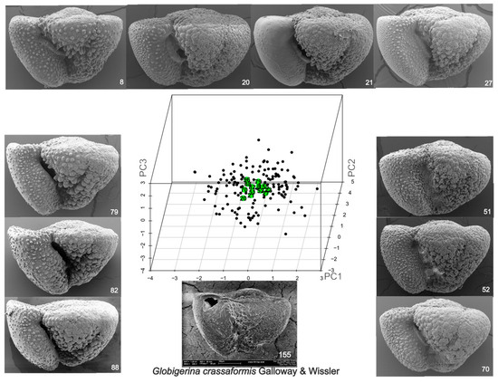 The centroid of the aggregated shape data (PC1-3, standardized scores) is located in a region where specimens are sparse. Only 14 specimens are included within ±0.5σ, whereas, if the aggregated data sampled a multivariate normal population, about 60 might be expected. However, this region does include specimens from all collections, with three to four from ETA, GM, and SWP, and one from LOM. As a group, all are normalforms (Figure 1F,H), or close thereto, but there are strong differences in the curvature of the outline at the periphery (Figure 1G) of some (e.g., #21 and #79). Indeed, the axial shape of #79 emulates that of Truncorotalia truncatulinoides (d’Orbigny, 1839) [20]) but has four rather than six chambers in the outer whorl.