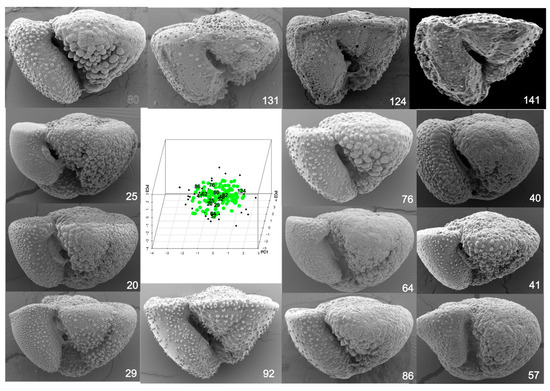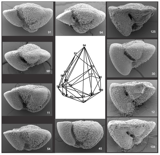 Specimen outlines were manually captured (tpsdig2 version 2.31, https://life2.bio.sunysb.edu/morph/soft-dataacq.html (accessed on 5 June 2024)) from SEM images as 180 equally spaced coordinates; use of binarizing algorithms is often more convenient. Raw data were processed using generalized procrustes analysis (GPA, R package shapes https://cran.r-project.org/web/packages/shapes/index.html (accessed on 5 June 2024)), which aligns specimens on their centroids and removes the size and positional differences. Principal component (PC) projections of the high-dimensional data for specimens onto 3 orthogonal axes retained 78% of the shape information and allowed for the inspection of the specimen configuration in low-dimensional Euclidean space. The convhulln function (R package geometry (https://cran.r-project.org/web/packages/geometry/index.html (accessed on 5 June 2024)) was used to construct the smallest convex hull for the samples in the PC1-3 space; the Delaunay triangulation of the points was plotted as a wireframe; clustering used the FKM algorithm [12]. Generalized canonical discriminant analysis (R package candisc, https://cran.r-project.org/web/packages/candisc/index.html (accessed on 5 June 2024)) provided a multivariate linear model of the samples using PC data.
