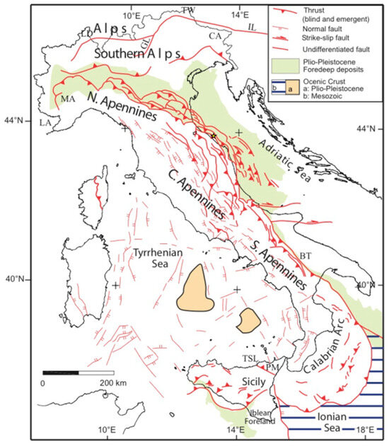 - Kastelic, V.; Vannoli, P.; Burrato, P.; Fracassi, U.; Tiberti, M.M.; Valensise, G. Seismogenic sources in the Adriatic Domain. Mar. Pet. Geol. 2013, 42, 191–213. [Google Scholar] [CrossRef]