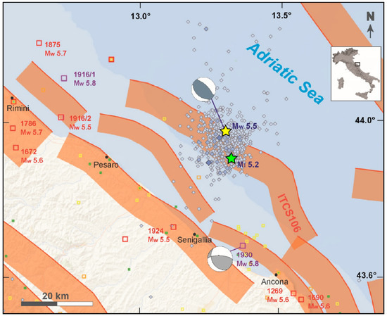 - Vannoli, P.; Vannucci, G.; Bernardi, F.; Palombo, B.; Ferrari, G. The source of the 30 October 1930 M w 5.8 Senigallia (Central Italy) earthquake: A convergent solution from instrumental, macroseismic, and geological data. Bull. Seismol. Soc. Am. 2015, 105, 1548–1561. [Google Scholar] [CrossRef]