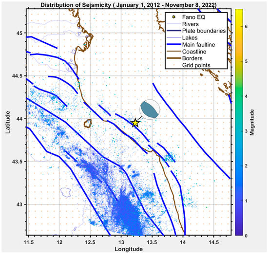 - Pezzo, G.; Billi, A.; Carminati, E.; Conti, A.; De Gori, P.; Devoti, R.; Lucente, F.P.; Palano, M.; Petracchini, L.; Serpelloni, E.; et al. Seismic source identification of the 9 November 2022 Mw 5.5 offshore Adriatic sea (Italy) earthquake from GNSS data and aftershock relocation. Sci. Rep. 2023, 13, 11474. [Google Scholar] [CrossRef]