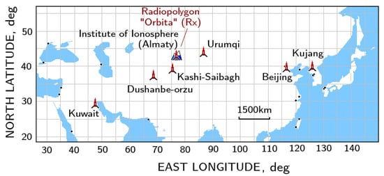 When measuring the Doppler frequencies on a longer inclined radio path with the length in the range of (200–3000) km, the transmitters of broadcasting stations are employed, as selected from the BBC Short-Wave catalog [30] for different times of day and seasons. The radio paths used in Doppler measurements are listed in Table 1, and the diagram of their relative layout is shown in Figure 1.