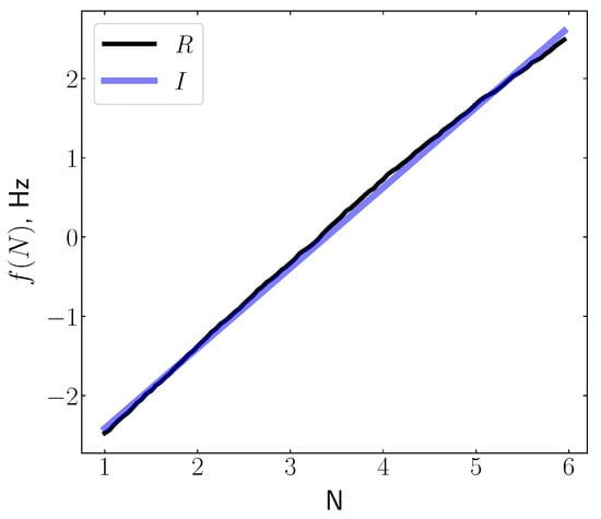 Comparison of the real characteristic (R) of the PLL conversion of the Doppler equipment with the ideal linear characteristic (I). The units along the horizontal axis are the number N of the succeeding frequency tunings (see text). The plot is taken from the publication Salikhov and Somsikov, 2014 [33].