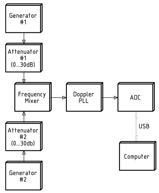 The measurement accuracy of the Doppler shift of ionospheric signal was determined in the measurements at a special test facility which imitated the conditions of multipath receiving. For the check of the Doppler installation, it was sufficient to use a pair of highly stable oscillators. As shown in Figure 4, two signals from the generators #1 and #2 come, through attenuators, to a frequency mixer, and the interference signal from the mixer output is fed to the input of the PLL-based Doppler equipment. Then, the signal at the output of the PLL is digitized by an ADC and recorded in the computer memory as a text file. The resulting signal of the beating between two frequencies can be simulated with the help of this test facility.