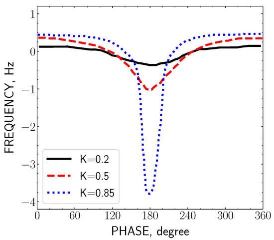 The change in the resulting frequency, per a cycle of the smaller-amplitude vector , as measured with the different ratios K between the amplitudes of the two sinusoids and .