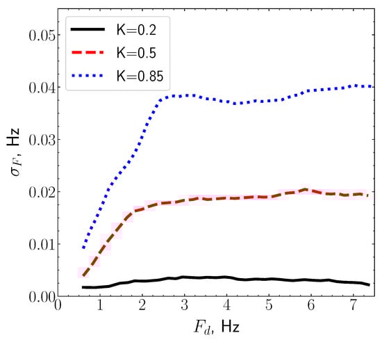 In Figure 7 a family of curves is shown which demonstrate the dependence of the measurement error of difference frequency for the various ratios K between the amplitudes of the summed signals: , , and . As it follows from this plot, the measurement error of Doppler frequency increases with the rise of the difference frequency . For any value of and Hz, the error always remains below 0.04 Hz. With decreasing K, the value of errors diminishes also, and at the error does not exceed 0.002 Hz. Also, a characteristic segment is seen in the graph of Figure 7, where all curves run parallel to the abscissa axis, and their bend begins at a value of Hz.