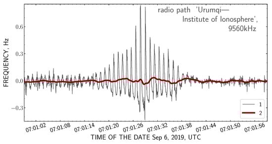 In Figure 8 an example is shown of the Doppler frequency shift registration by receiving of a real two-beam ionospheric signal on the inclined radio path “Urumqi—Institute of Ionosphere” at a frequency of 9560 kHz. It can be seen there that by selection of the interference signal with the low-pass filter, the Doppler frequency of the larger-amplitude beam was clearly distinguished.