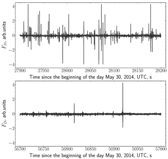For identification of the short-term Doppler bursts, additional units were incorporated into the functional scheme of the hardware-software complex of Doppler measurements: a high-pass frequency filter and a DC amplifier with the regulated gain. In Figure 2 above these two blocks are indicated by hatching. The signal from the output of the phase detector comes to the filter, where its high-frequency component is selected. Then, after amplification, this signal is digitized with a periodicity of 25 Hz by the second ADC channel, and the results are kept in the computer memory. The calculation and graphical visualization of the variations in the intensity of short-term Doppler bursts is made by a specially developed program.