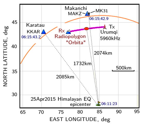 The M7.8 25 April 2015 earthquake in Nepal occurred at 06:11:23 UTC. The epicenter was located at 28.231° N, 84.731° E, and the depth of its focus was of 8.2 km [37]. The disposition of the hardware-software complex of Doppler measurements relative to the epicenter of the earthquake is presented in the diagram of Figure 10. In these measurements, we used the transmitter of a broadcast radio station in Urumqi, which operated at a frequency of 5960 kHz. The radio receiver of the Doppler installation is placed in the Radiopolygon Orbita point, at a distance of 805 km from the transmitter. The projection of the radio wave reflection point on the ground (sub-ionospheric point) was located at a distance of 1732 km from the epicenter of the earthquake. The Dobrovolsky radius ( km), which determines the size of the zone of deformation processes in the period of earthquake preparation [38], equals to 2259 km for a M7.8 earthquake. Therefore, the monitoring results of Doppler frequency obtained in the said sub-ionospheric point can be used for an objective estimation of the state of the ionosphere at this earthquake.