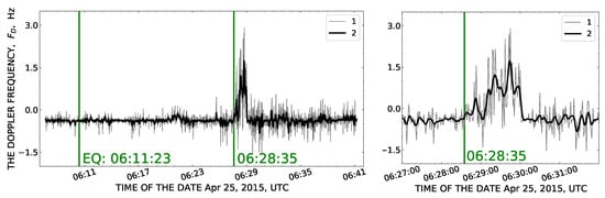 An important advantage of Doppler method is its high sensitivity and ability to detect the disturbances in the ionosphere even at considerable distance from an earthquake. Thus, as shown in Figure 11, the seismogenic disturbance from the Nepal earthquake was distinctly observed in the Doppler frequency shift at a distance of 1732 km from the epicenter. The disturbance, with an amplitude above 2 Hz, was detected at 06:28:35 UTC, approximately 17 min (1032 s) after the main shock, and lasted about 91 s.