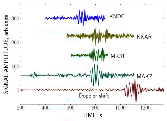 The fragments of the Doppler shift record and of the seismograms of Z-component written on 25 April 2015 at different distances from the epicenter, at the stations in Makanchi (MAKZ, MK31), Karatau (KKAR), and Almaty (KNDC). The scale of the horizontal axis is expressed in seconds passed since the moment of the earthquake.