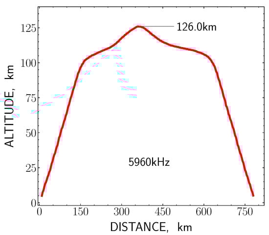 Then, using the calculated profile of the electron concentration, the path of radio wave propagation was defined by a special program, which took into account the geomagnetic field in accordance with the IGRF13 model for the ordinary component. The result of the calculation is shown in Figure 13, where it is especially indicated the reflection height of the sounding radio wave at 126.0 km.