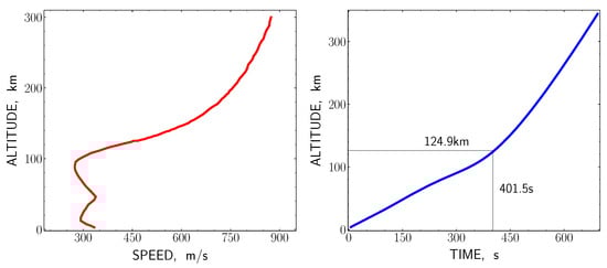 In this section, to determine the height in the ionosphere, which an acoustic wave propagating vertically upward from the earth’s surface reaches in 401.5 s, we use the calculation of an altitude profile of the sound speed with account to the viscosity and thermal conductivity of the atmosphere. The calculation method, based on the international atmosphere model NRLMSISE-00, is described in [43,44]. The calculation was made for the coordinates of the sub-ionospheric point in the earthquake time, and for an accepted index of solar activity . The result is shown in the left frame of Figure 14 as a plot of the altitude profile of the sound speed.