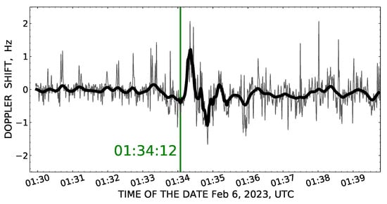 The response in the Doppler frequency shift of ionospheric signal to the earthquake in Turkey on 6 February 2023, as detected at the radio path “Kuwait—Institute of Ionosphere (Almaty)”. Thin curve—original measurements, bold curve—same data smoothed by a 10 points running average filter. The vertical line indicates the beginning of the ionospheric disturbance in the reflection point of radio waves at 01:34:12 UTC. The plot is taken from the publication Salikhov et al., 2023 [26].