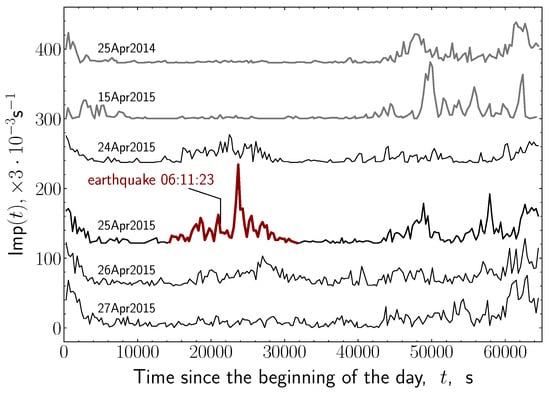 Intensity of the short-term Doppler bursts detected by the modified method of Doppler measurements before and in the time of the M7.8 Nepal earthquake. The scale of the abscissa axis is expressed in thousands of the seconds passed since the beginning of the day in local time; each distribution covers the time interval of ∼18 h. Along the ordinate axis, the counting rate of short-term Doppler bursts is recorded; the curves are displaced in vertical direction for convenience of comparison.