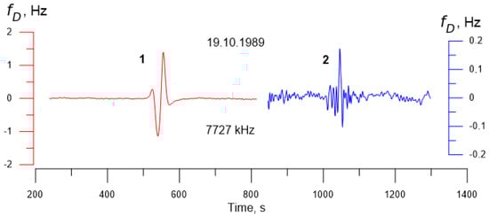 Two samples of the short-term Doppler bursts reflecting the ionization flashes in the ionosphere. The vertical axis is expressed in the units of Doppler frequency .