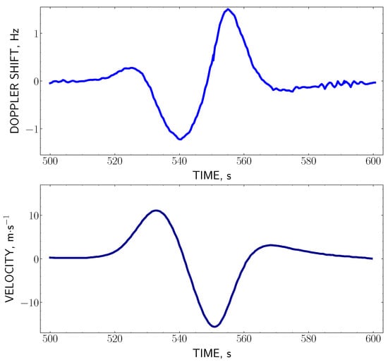 Figure 20 and Figure 21 show the records of the Doppler frequency shift and reconstructed velocity profiles in the reflection point of sounding radio wave for the two acoustic pulses which were propagating from the underground nuclear explosions carried out at the Semipalatinsk nuclear test site on 17 December 1988 and 19 October 1989.
