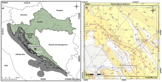 The study area of Bribirske Mostine (Figure 1a) is covered by the BGMY sheet of Šibenik at a 1:100,000 scale, which was developed during the 1960s [24] (Figure 1b). As the BGMY was developed 60+ years ago, expert reports and scientific research indicate that there is room for its improvement in terms of scale and the presented data [26]. The study area is focused on the ~90 km2 research area, located between 43°55′00′′ and 44°00′00′′ northern latitude and 15°45′00′′ and 15°52′30′′ eastern longitude. Translated into the official coordinate system used in the Republic of Croatia (HTRS96/TM Croatia), this is an area located between 4873581 N and 439529 E and 4864272 N and 449396 E.