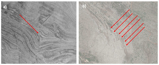Aerial image interpretation examples with marked bedding offset (red arrow): (a) segment from image from 1959 with marked offset of series of beddings on larger area, indicating a significant fault for the area; (b) segment of an image from 2020 with marked series of offsets of bedding segments in a smaller area, indicating a zone with multiple faults.