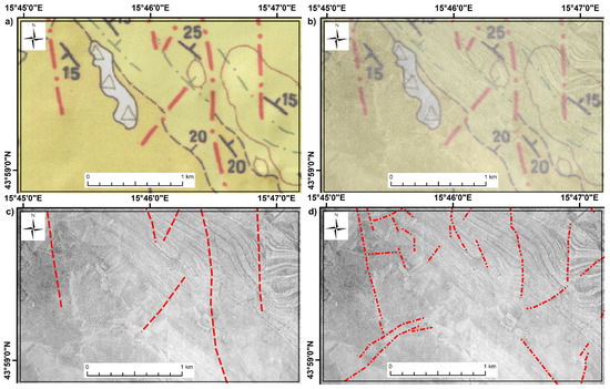 Another relevant factor for remote mapping is vegetation cover, i.e., its presence, type, or density [22,27,46,47]. From this viewpoint, aerial images from 1959 are a good example of sparse vegetation. More specifically, the study area is in a bare karst area, and the vegetation is scarce or non-existent, so the reinterpreted faults were (generally) determined with great confidence and added value (in number and spatial positioning) to the existing historical fault data set (Test Site 1, Figure 4a–d).