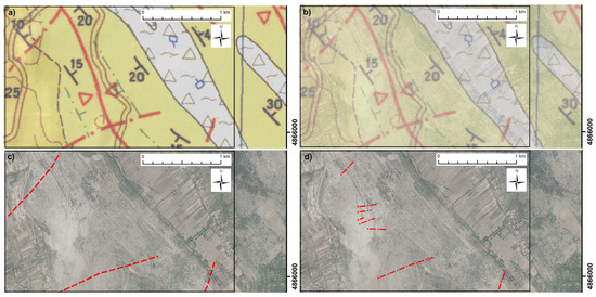 Study area segment (Test Site 2; for test site locations, also refer to Figure 2): (a) details from the historical geological map (BGMY, [24]); (b) same details overlapped with aerial images from 2020; (c) dashed lines indicate digitalized original faults; (d) dash-dot-dash lines indicate developed fault data set.