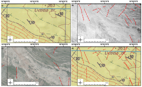 The original data state (BGMY segment) is shown in Figure 4a and Figure 5a. With the overlapping of the BGMY segment and the aerial images from 1959 (Figure 4b) and 2020 (Figure 5b), spatial discrepancies can be observed. The digitalized fault lines from the BGMY are presented on the correctly positioned aerial images from 1959 (Figure 4c) and 2020 (Figure 5c), with visible historical fault data set offset. Spatial error occurring in the fault line positioning is probably due to the available technologies used 50+ years ago in geo-referencing. The newly developed, more abundant, and spatially precise fault data set on the spatially correctly positioned aerial images from 1959 and 2020 is presented on Figure 4d and Figure 5d. The upgrades to the existing fault data set can be tracked in Figure 4a–d and Figure 5a–d. A segment of the BGMY without fault lines is presented in Figure 6a. However, in both of the aerial images of the same area from 1959 (Figure 6b) and 2020 (Figure 6c), faults can be interpreted. If the new fault data sets are overlapped with the original BGMY segment (Figure 6d), the result (difference) is pronounced (Figure 6a–d). The presented analysis of Figure 4, Figure 5 and Figure 6 is a result of cabinet research.