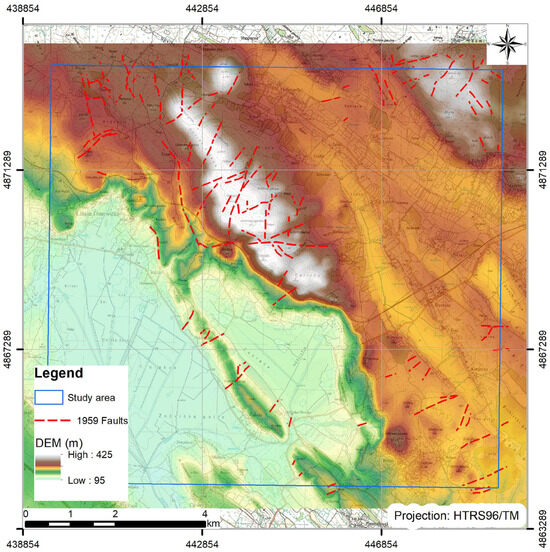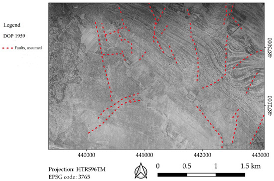 On the available archive field maps and BGMY, only a couple of the assumed photo-geological interpreted faults are presented for the research area of ~90 km2 (red dash dot lines, Figure 1b). For the performed cabinet analysis of the aerial images from 1959 and 2020, the same approach was adopted: only faults according to the described mapping criteria were identified, all of the identified faults were marked as assumed as they were identified in cabinet (without field verification), all of the faults were interpreted in the same way (photo-geological interpretation or assumption), and all of the faults were marked the same way (with red dash dot lines on developed map).