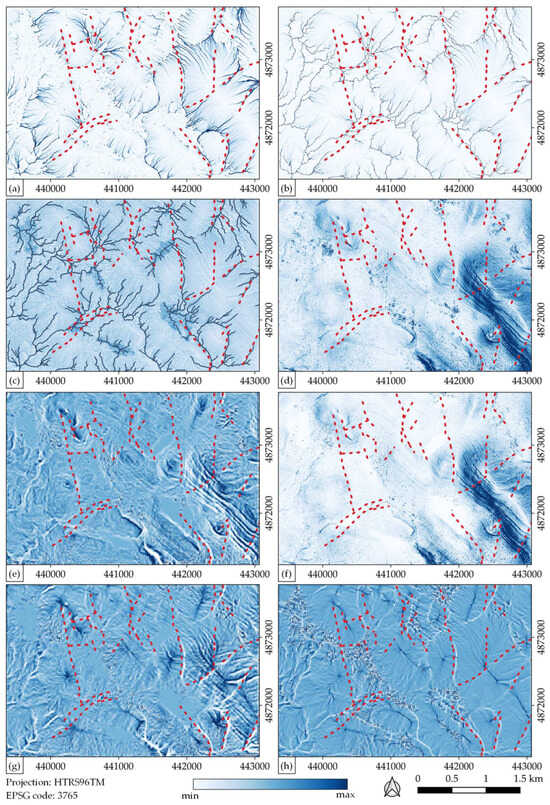 Raster analysis for semi-automatic process of developing digital data sets (detail): (a) flow accumulation; (b) total catchment area; (c) topographic wetness index and channels (dark blue solid line); (d) slope inclination; (e) profile curvature; (f) LS factor; (g) plan curvature; and (h) convergence index. The red dashed line represents developed fault data set.