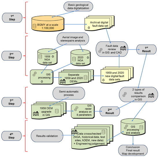 The herein-used methodology can be described as a four-step process (Figure 11): (i) the development of digital data sets from analog historical data (maps, images, etc.); (ii) the re-evaluation of historical data sets and the analysis of relevant data; (iii) the use of auxiliary methods that could improve the results; and (iv) result verification and final product development (new data sets, new map, etc.). By applying this relatively simple (herein-presented) methodology, multiple benefits can be achieved, including: (i) improvements in data quality (spatial positioning); (ii) improvements in data quantity (data abundance); (iii) improvements in data presentation (an upgraded map scale); and (iv) the development of new digital georeferenced data sets that are easily further updated and transferred within multiple platforms for new analysis, research, and usage. An important aspect of the specific contribution of this research is the possibility to apply it to a wider regional area in terms of improving the existing geological data (fault data sets in particular and mapping data), and at the same time, doing it uniformly at the regional level with transcending political borders.