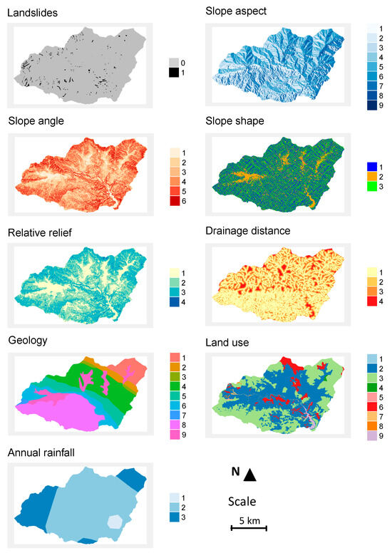 For demonstration and discussion, we consider a case study derived from Kayastha et al. [41] and De Smedt et al. [23]. In these studies, conditional probabilities were calculated to predict landslides in a river basin in Nepal. The basin covers an area of 124.26 km2 and 295 landslides were observed, ranging in size from about 400 m2 to 0.1 km2. The total area of landslides is 2.35 km2 or 1.9% of the total basin. The prior probability of landslides is therefore . The geo-environmental conditions that influence landslides consist of eight factors with three to nine classes, as listed in Table 2. All factors are categorical and given in the form of raster maps with a resolution of 20 m, as shown in Figure 1. Details can be found in the original studies.