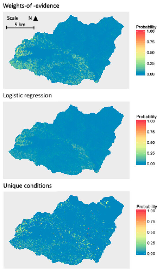 Maps of the estimated posterior probabilities obtained with the different models are presented in Figure 3. Note that the distribution of the probabilities is very skewed. Most values are lower than the prior probability and correspond to areas where landslide susceptibility is very low. These areas are marked with the blue color in the figures and cover a large part of the study area. Posterior probabilities that are greater than the prior probability are marked by the green and yellow colors in the maps. These are areas prone to landslide and mainly occur in the eastern and southern parts of the study area. Note that the map obtained with weights-of-evidence shows more of these areas than the other maps, which is the result of the model bias leading to an overprediction of landslide susceptibility. Also note that that the unique conditions model indicates some landslide-prone areas in the northeastern part of the domain that are absent or less pronounced on the other maps. Orange and red colors indicate areas with very high landslide susceptibility. Such areas are present in the western part of the map obtained with the unique conditions model and, to a lesser extent, in the map obtained with weights-of-evidence, but the latter is likely due to overprediction due to model bias.