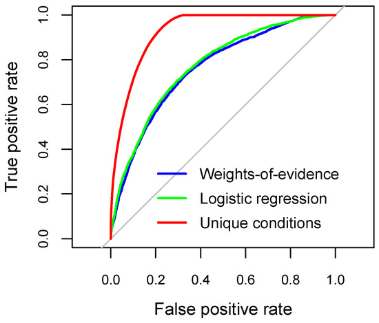 ROC curves obtained using weights-of evidence, logistic regression, and the unique conditions model.