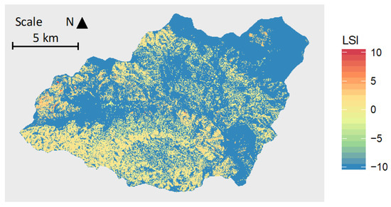The resulting LSI map for the present case is shown in Figure 5. Since the probability values can be zero or one, the weights can go to infinity. Therefore, the weights are limited to a range of −10 to +10. The LSI map shows much more detail than the posterior landslide probability maps. LSI values around zero are represented by the yellow color and correspond to areas that are no more or less prone to landslides than observed. Negative LSI values, represented by the green and blue colors, indicate areas not prone to landslides. These take up a large part of the basin. On the other hand, areas with orange and red colors are prone to landslides and cover only some small parts of the basin. Thus, transformation of posterior landslide probability into corresponding LSI values allows a simple and clear interpretation of landslide susceptibility.