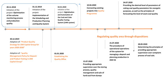 The establishment of the new Quality Management Office formed part of the “Product Quality Strategy for the JSW Capital Group for 2020–2030”, adopted by the Management Board. The “Quality Management Policy for Deposit and Product Testing in the JSW Capital Group” ensures the desired level of qualitative parameters of coking coal and steam coal, as well as the rules for forecasting the qualitative parameters of steam coal [15]—see Figure 1.