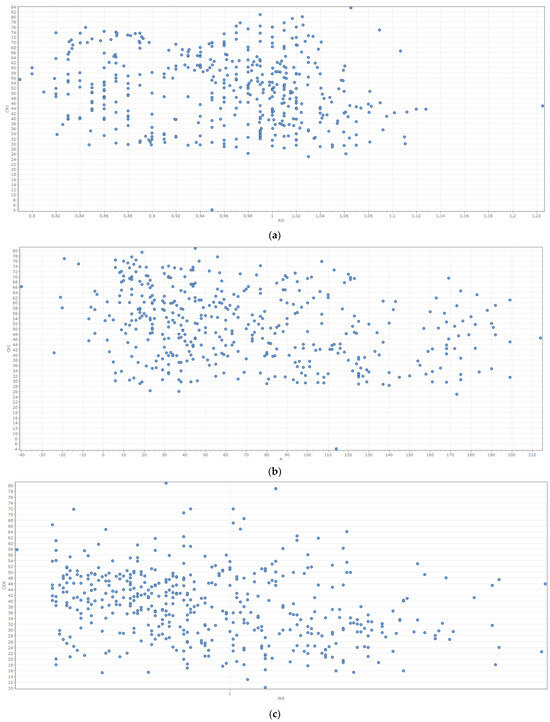 Scatter plots of factors potentially influencing the outcome variables: (a) Vitrinite reflectivity (RO) vs. CRI. (b) Dilatation (B) vs. CRI. (c) Moisture content (WA) vs. CSR.