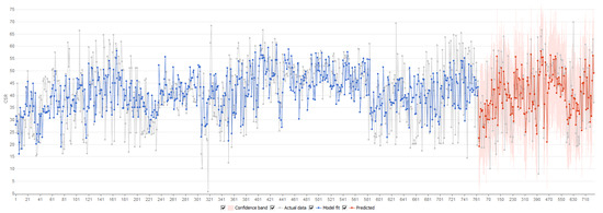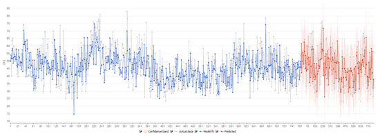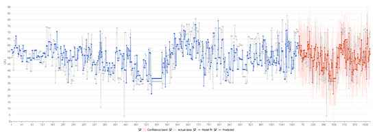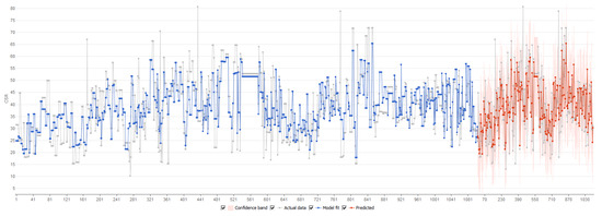 The plot of actual data and model fit for CSR (Coke Strength after Reaction) under the conditions of the Szczyglowice mine is represented in Figure 13. This figure provides a visual comparison between the observed values and the predicted values generated by the model, offering insights into the model’s accuracy and reliability.