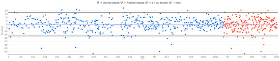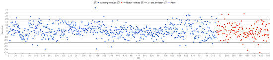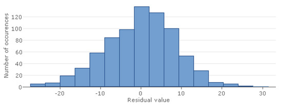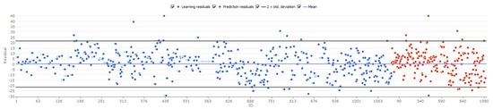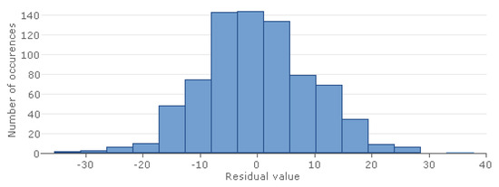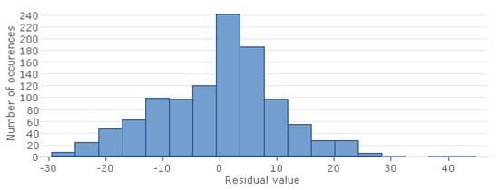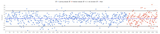 Accuracy of the model: Coefficient of determination R2 = 0.72 for the training dataset and R2 = 0.69 for predicted data. Mean absolute error (Equation (1)) MAE = 7.1 for the training dataset and MAE = 7.6 for predicted data. The variation of residuals is represented in Figure 14.