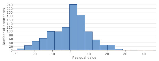 The distribution of residuals (Figure 15) does not significantly deviate from the Gaussian normal distribution; however, outliers are noticeable in both negative and positive directions.
