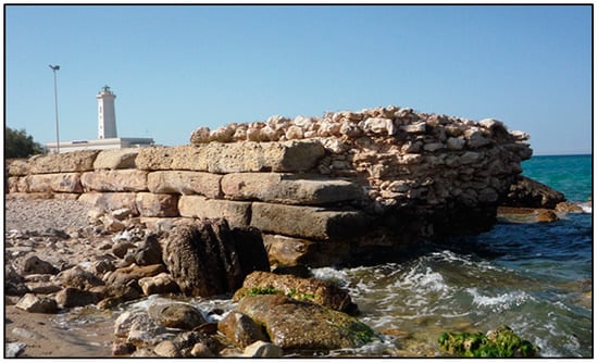 - Sammarco, M.; Margiotta, S.; Foresi, L.M.; Ceraudo, G. Characterization and provenance of building materials from the Roman pier at San Cataldo (Lecce, Southern Apulia, Italy): A lithostratigraphical and Micropaleonthological approach. Mediterr. Archaeol. Archaeom. 2015, 15, 101–112. [Google Scholar]