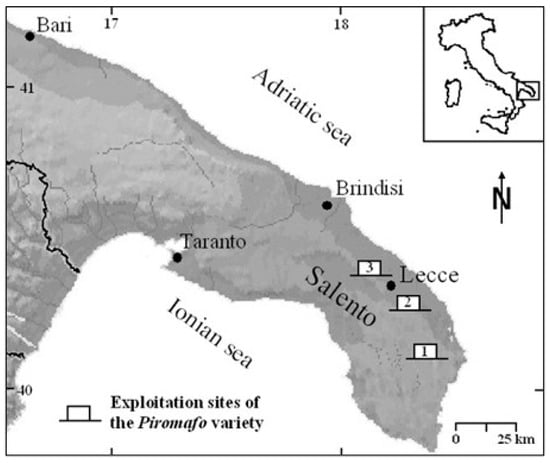 The geographic location of the main extraction areas of the Piromafo variety: (1) Cursi, Melpignano, Martano, Zollino, and Poggiardo; (2) Vernole, Vanze, Strudà, Acaya, and Pisignano; (3) Novoli and Surbo.