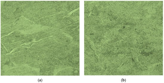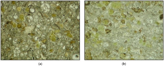 A rock fabric examination was performed with transmitted light on standard thin sections using an optical polarizing microscope. Thin sections were taken from specimens at orthogonal orientations; half were cut parallel (two for each study site) and half at right angles (two for each study site) to the quarry walls (Figure 4). The Piromafo stone reveals homogeneous minero-petrographic characteristics and is almost exclusively formed from low-Mg CaCO3 (about 90%). A much lower quantity of glauconite, apatite, and rare quartz grains are present, as well as clayey minerals finely distributed in the matrix with a carbonate composition. In fact, Piromafo records the maximum insoluble residue content (12%) among the varieties of the Pietra Leccese Fm. []. Two types of glauconite granules are recognised, one of green colour mostly concentrated in layers, and the other of yellowish colour, finely dispersed in the matrix. Previous studies have shown that these are granules of glauconite with different chemical compositions varying in the content of SiO2 and Fe2O3 (47.09% and 24.07% for the green glauconite and 28.88% and 46.36% for the yellowish glauconite, respectively) [].
