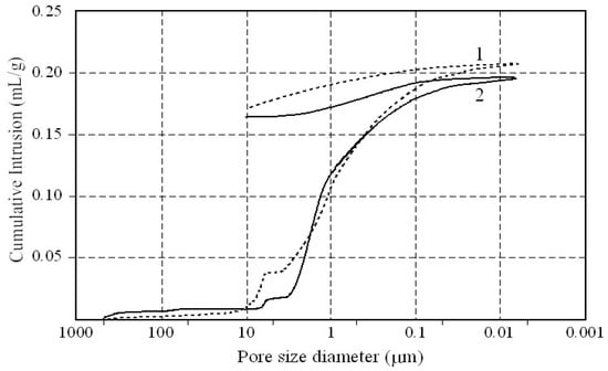 Cumulative intrusion/extrusion curves as a function of pore diameter measured by Mercury Intrusion Porosimetry (MIP) for two samples from the two extraction areas: (1) Cursi-Melpignano; (2) Strudà-Acaja.