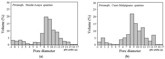 According to the rock type classification of The Geological Society of London [], Piromafo is a medium/fine-grained calcarenite with a pore network constituted, almost in its entirety, of capillary pores smaller than 4 μm (Figure 5). The MIP (Mercury Intrusion Porosimetry) measures give interesting information not only about the volume of open voids, but also about pore shape and size, thus providing an important tool for understanding the contribution of porosity and the 3D pore system with respect to the material’s durability [].