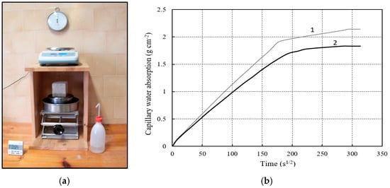 Capillary water absorption experimental device (a) and results (b): (1) Cursi-Melpignano; (2) Strudà-Acaja.