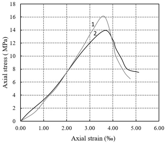 Considering the engineering classification for intact rock by strength and deformation properties after Deere and Miller [], Piromafo is characterised by a very low strength (E) and average modulus ratio (M). According to the classification of the Apulian calcarenites (AC) by strength and rock fabric features after Andriani and Walsh [], Piromafo is a moderately soft rock (AC1). Complete stress–strain curves illustrate that Piromafo is a material with medium stiffness and medium brittleness (Figure 8).
